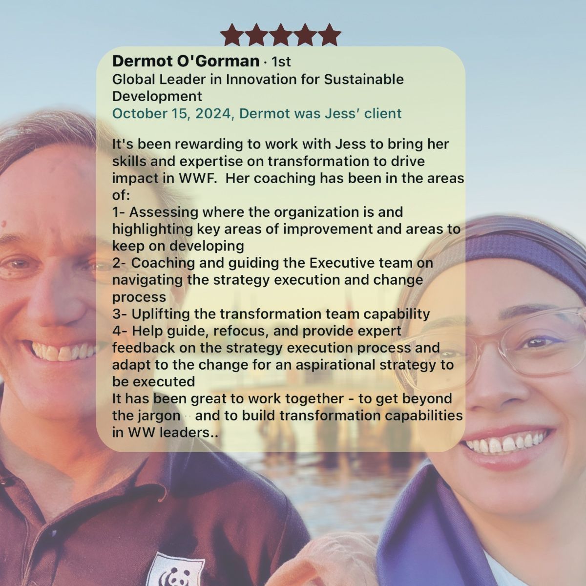 "For Business Transformation Executives and leaders: I recently joined the transformation executive coaching and mentoring program with Jess. The program has proved invaluable and helped me unlock next-level thinking related to the following: Solving critical and complex leadership problems Sell my value at a higher level Gain higher levels of influence and impact Navigate culture and political landscape Reduce levels of stress and overwhelm Build a high-performing team Reduce change resistance and conflict that comes with transformation Navigate high level executive career progression Accelerate my development at higher levels of leadership Increased levels of self-awareness Taught me how to play to my strengths and become better at what I do without burning out It’s hard to find an expert who is highly empathetic, not afraid to tell you what you may not want hear, and make you see what you can’t see, to open up higher levels of awareness… who is also a great listener, easy to open up to and a highly trusted individual who genuinely cares. I feel more confident having Jess as my coach & mentor as a guide in my next chapter as a senior executive leader."