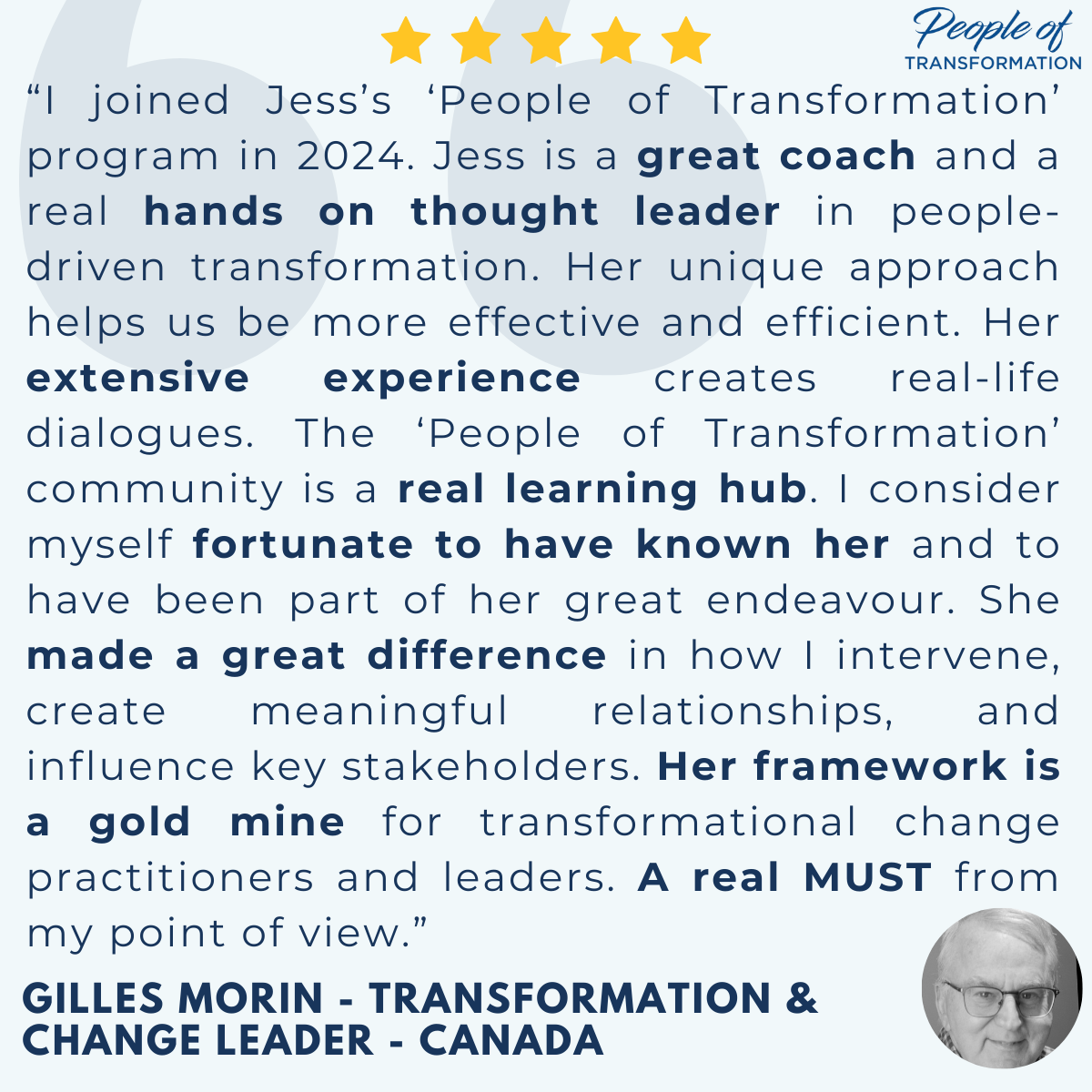 "I am incredibly grateful and honored to have been part of Jess’s extraordinary community of transformation leaders. Her influence on my personal and professional growth has been joyful, stretching, and truly transformative. When I joined Jess’s community, I was on maternity leave and at a crossroads in my transformation career. Uncertain of my next step, I chose to take action, seeking to uncover my unique value in the market. A serendipitous conversation with another transformation leader led me to Jess’s phenomenal community, and I felt an immediate pull to join. I knew it was the right place to refine my skills and build meaningful connections in the transformation space. Through Jess’s guidance and the support of the community, I gained invaluable insights; not only in business agility, behavioral science, strategy, and storytelling but also the courage to express my perspectives with confidence and competence. Her coaching has left a lasting imprint on me, shaping the way I approach transformational leadership. Jess is an exceptional mentor, an inspiring leader, and a remarkable human being. For anyone looking to elevate their transformation expertise and lead with both heart and clarity to drive exceptional business outcomes, Jess is the person to know, follow, and collaborate with."